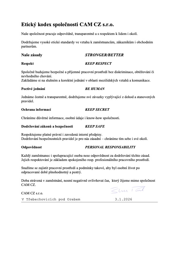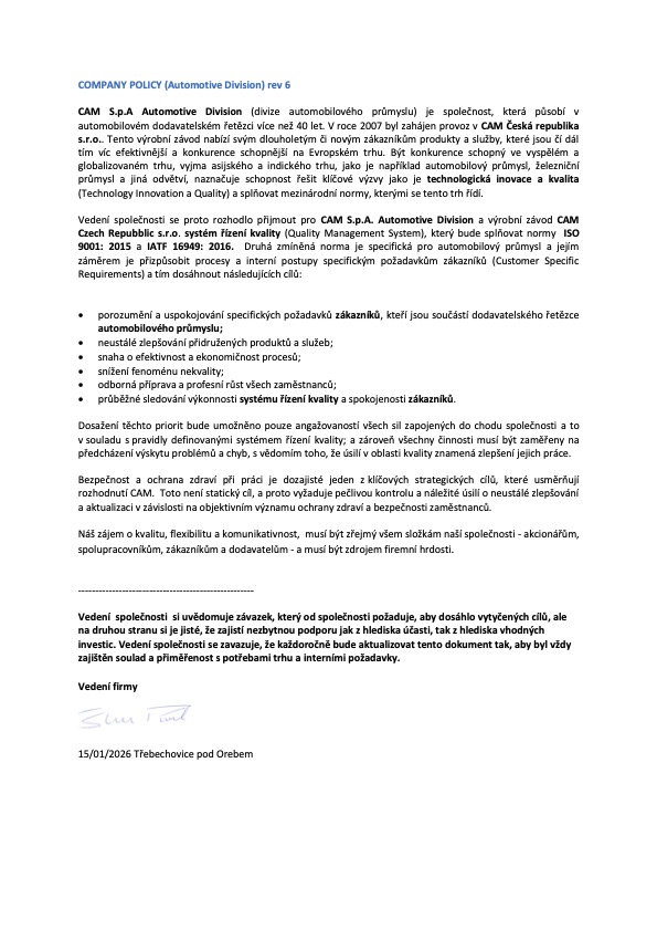 V CAM víme, že kvalita není pouze o splnění norem, ale o překračování očekávání. Věříme, že skutečná kvalita pramení z harmonického spojení lidí, procesů a technologií, kteří se věnují svému řemeslu s vášní a závazkem k co nejlepšímu výsledku.